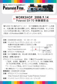 ポラロイドフィルムForeverワークショップ 札幌会場 「Polaroid SX-70体験撮影会」 憧れのSX-70に触れるチャンス!SX-70経験者と初心者が チームを組み、大通公園と狸小路を撮影します。撮影後は作品発表、そしてお気に入りの作品を壁に貼って飾ります。作品返却時には、皆さんの写真が詰まったPhotoBookも無料プレ ゼントしちゃいます。ふるってご参加ください。 開催日時:9月14日(日) 13:30~17:00 会場: ・マッキナフォトグラフィカエンスージャスタ(集合・作品発表等) 札幌市中央区南1条西12丁目ASビル4階 (cholonさんが入っているビルです) Tel 011-802-8491 Fax 011-802-8497 http://macchinafoto.com ・大通公園、狸小路(撮影会) 対象者:ポラロイドが好きなSX-70経験者とポラロイドに興味のある初心者 定員:経験者10名、初心者10名(先着順、キャンセル待ち あり) 参加費:無料 ※600filmはこちらで準備いたしますが(お一人様 10枚入1パック)、お持ち込みも可です。 お申込・お問い合わせ先: お申込の際は、ご住所、お名前、電話番号、メールアドレス、経験者か 初心者か、SX-70の所有の有無、ご自身のものを使うかレンタルするかを明記のう え、ポラロイドフィルムForever工藤(kudar@d1.dion.ne.jp)ま でお申込みください。 subjectは「ワークショップ申込み」でお願いします。 ※当日13:30までにマッキナフォトへお越しください。 ※経験者の方は作品を数点、お持ちください。 ※個人情報は当イベントおよび作品返却時以外の目的では使用いたしま せん。 募集締切:9月12日(金) 主催:ポラロイドフィルムForever 後援:マッキナフォトグラフィカエンスージャスタ |