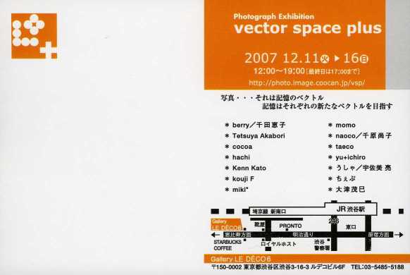 | Photograph Exhibition vector space plus 写真・・・それは記憶のベクトル 記憶はそれぞれの新たなベクトルを目指す 会期 2007年12月11日(火)~16日(日) 12:00~19:00(最終日のみ17:00まで) 場所 ギャラリー ル・デコ 住所 東京都渋谷区渋谷3-16-3ルデコビル6F TEL: 03-5485-5188 |